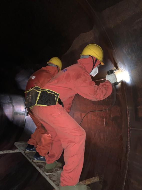 上午11:00,在绍兴凤登环保有限公司,市特检院5名检验人员正在对100m3大型液氨储罐进行定期检验。通过狭小的人孔,钻入密闭闷热的储罐,检验员们背着重重的检验仪器设备,在罐内进行着半蹲、侧卧等检测操作,对储罐进行内部宏观检测、壁厚测定、超声和磁粉等无损检测,绝不放过任何一个安全隐患。接下来,特检员们将陆续对该公司11台储罐进行开罐检验。