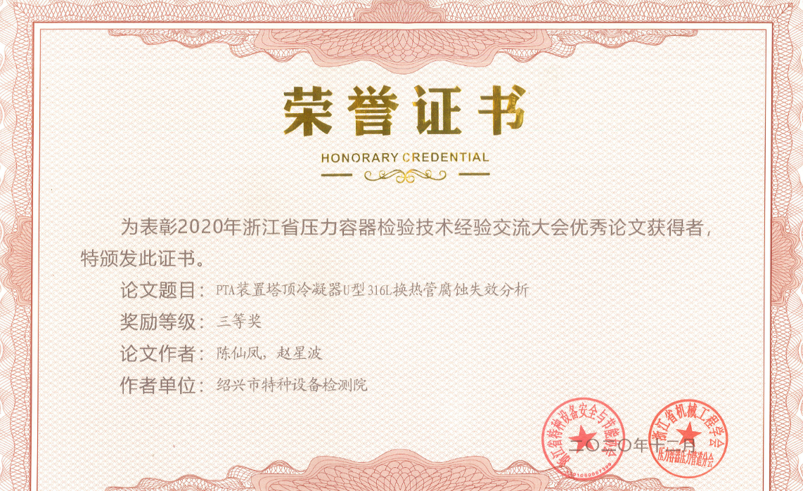 近日,由浙江省特种设备科学研究院、浙江省特种设备安全与节能协会联合举办的“浙江省压力容器检验检测评价技术交流会”在杭州召开。我院《基于FTA的不锈钢管壳式换热器失效模型安全评价分析》、《PTA装置塔顶冷凝器U型316L换热管腐蚀失效分析》分别获优秀论文二等奖和三等奖,并在大会上作交流报告。