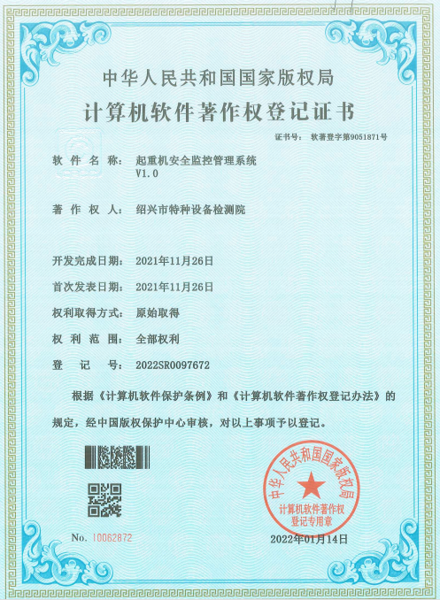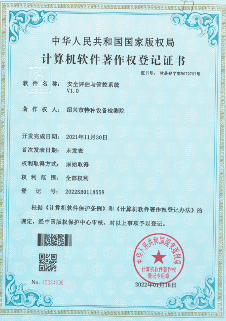 近日,经国家版权局审查批准,绍兴特检院《起重机安全监控管理系统》和《安全评估与管控系统》两项软件著作获得授权。