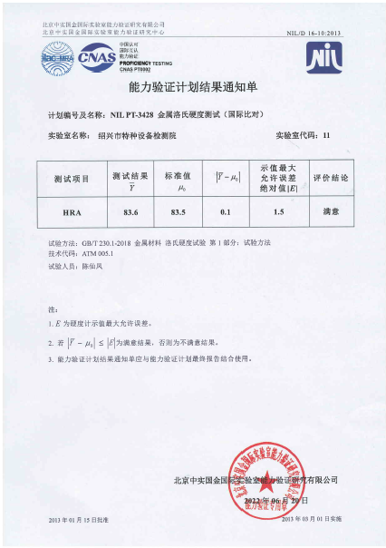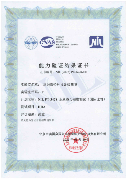绍兴市特检院洛氏硬度国际比对获满意结果