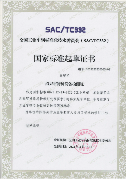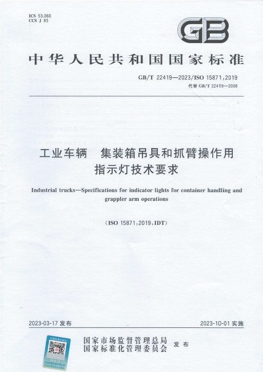 近日,国标委发布了2023年第1号公告,由绍兴特检院参与制定的GB/T 22419-2023《工业车辆 集装箱吊具和抓臂操作用指示灯技术要求》国家标准批准发布,将于2023年10月1日正式实施。