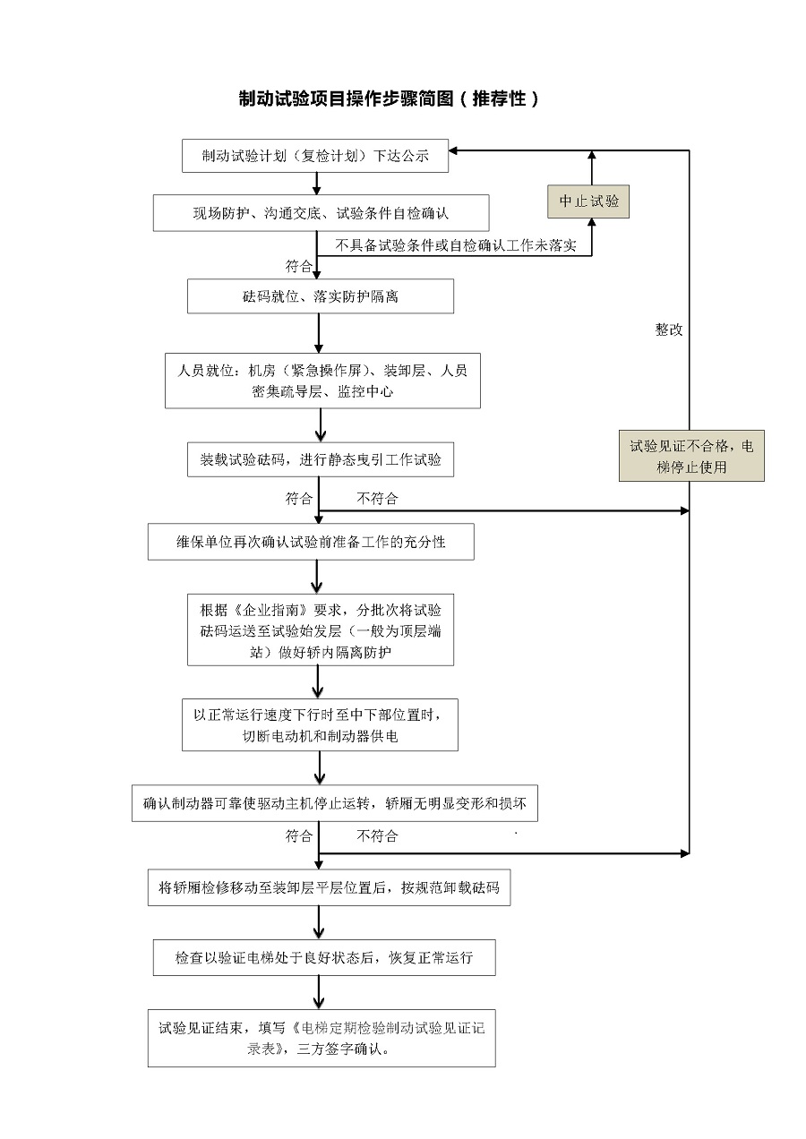 3、制动试验前应进行试验条件自检确认,由各维保单位自主编制《自检确认记录》。在切实做好试验条件自检确认工作后,出具《自检确认记录》,并提交给使用单位确认。关于试验条件自检确认的相关要求请参见本指南“(二)试验条件自检确认”。